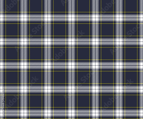 Obraz premium Plaid fabric pattern, navy blue, white, yellow, seamless for textile and design clothes skirt pants apron tablecloth blanket or decoration fabric. Vector illustration.