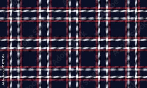 Fototapeta premium Plaid fabric pattern, navy, red, white, seamless for textiles, and for designing clothes, skirts, pants or decorative fabrics. Vector illustration, easy to edit file.