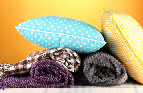 © Africa Studio, Fototapeta premium Plaids and color pillows on yellow background