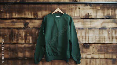 Fototapeta premium plain blank forest green Gildan 18000 swearshirt mockup hanging from a pretty rod