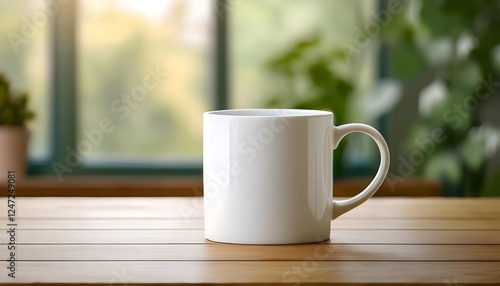 © Stanislava, Fototapeta premium Plain blank white ceramic mug mockup standing on the wooden table