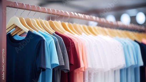 © Muzamil, Obraz premium plain t-shirts of different colors hang on a hanger, store interior blur.