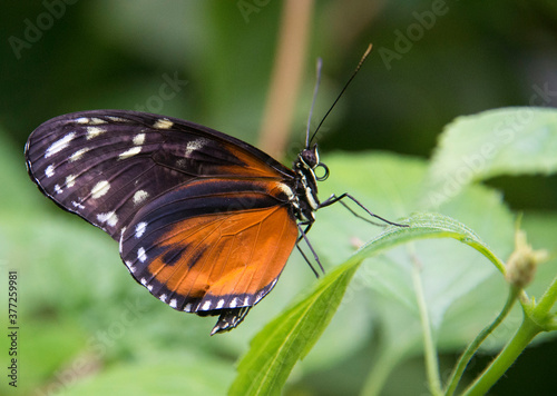 Fototapeta premium Plain Tiger butterfly on a green leaf in Victoria Butterfly garden in British Columbia, Canada