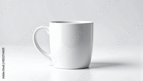 © Graphiloom, Fototapeta premium Plain white ceramic mug with handle on left, placed on light gray background