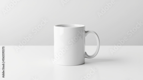 Fototapeta premium Plain white mug sits on clean surface, perfect for beverages or customization. Its simple design offers versatility for any setting