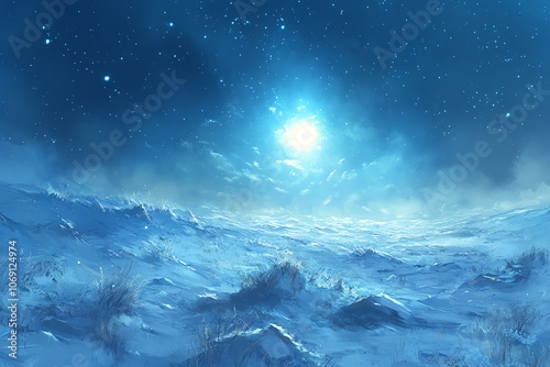 © JBMotillon, Fototapeta premium Plaine déserte couverte de neige sous un ciel étoilé lumineux..