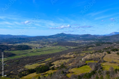 Naklejka premium Plains with fields and forests with Vremščica hill in the background in...