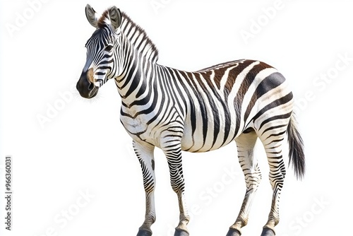 © Vitalii But, Fototapeta premium plains zebra captivates attention with its vibrant striped coat and swishing tail, embodying the beauty of wildlife in an elegant and isolated setting.