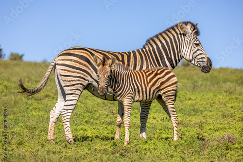 © Gunter, Obraz premium Plains zebra, equus quagga, equus burchellii, common zebra, with a foal, Addo Elephant National Park, South Africa.