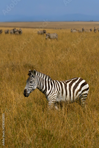 © Karlos Lomsky, Naklejka premium Plains zebra (Equus quagga), formerly Equus burchellii, a herd of zebras on the Masai Mara plains.