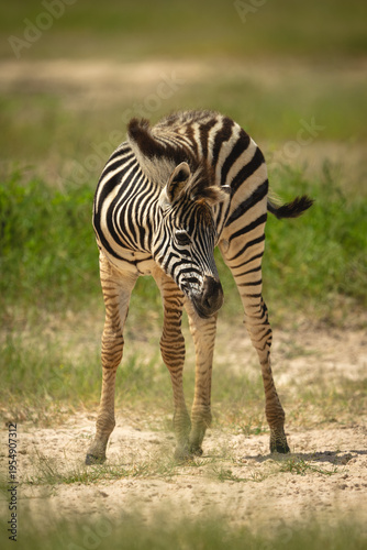 © Nick Dale, Fototapeta premium Plains zebra foal faces camera hanging head