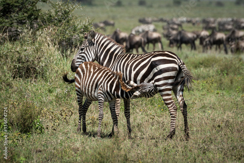 © Nick Dale, Fototapeta premium Plains zebra nursing foal by great migration