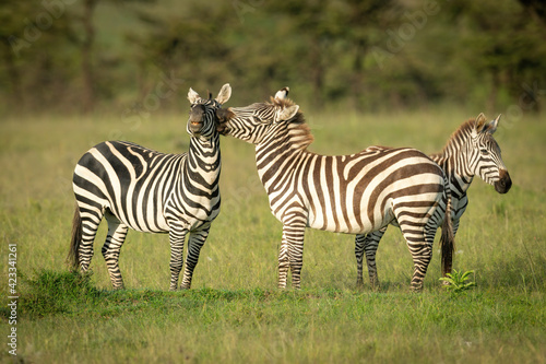 © Nick Dale, Fototapeta premium Plains zebra stands biting another near trees