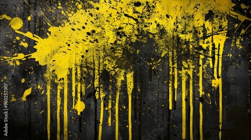 Naklejka premium Plakat z miejskim graffiti w stylu street art z teksturą grunge i półtonową w odważnych odcieniach żółtego i czarnego, z elementami zniszczonymi rysunkami pędzlem, ściekającym tuszem i rozpryskami farby w stylu vintage