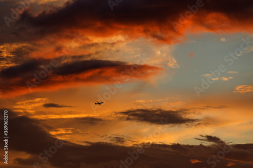 © Mircea Costina, Obraz premium Plane on red sky in sunset