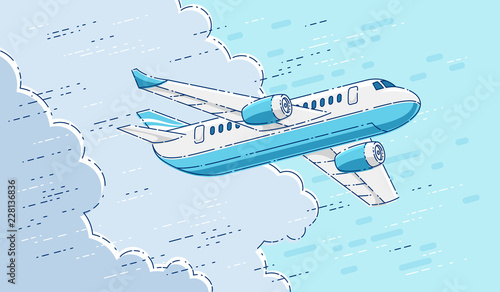 © Sylverarts, Fototapeta premium Plane passenger airliner flying in the sky surrounded by clouds, beautiful thin line 3d vector illustration.
