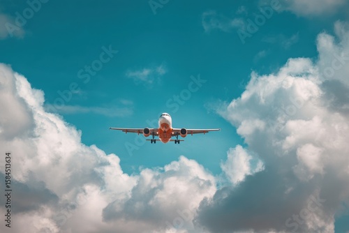 Obraz premium Plane soaring in a blue sky with fluffy clouds