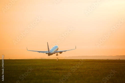 © Dmitry_Evs, Obraz premium plane taking off sunset