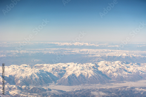 Fototapeta premium Plane Window View, Snow Mountains Aircraft Fly Landscape, Looking from Plane...