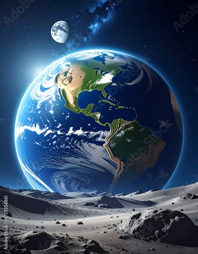 © Rani, Fototapeta premium Planet and moon in a space scene. Earth glowing, lunar surface below
