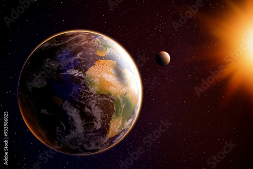 © New Africa, Obraz premium Planet Earth and moon lit by Sun in space. Image elements furnished by NASA