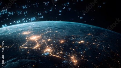 © Berkah, Obraz premium Planet Earth, city lights and cellular digital network growing binary data.