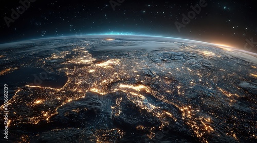 © SaroStock, Fototapeta premium Planet earth from space shows city lights and sunrise over the horizon during a dark night