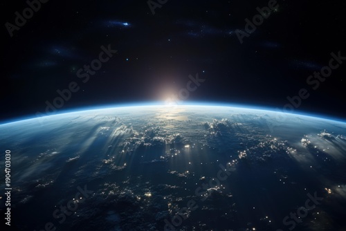 © nsit0108, Fototapeta premium Planet earth glowing during sunrise, seen from orbit in deep space