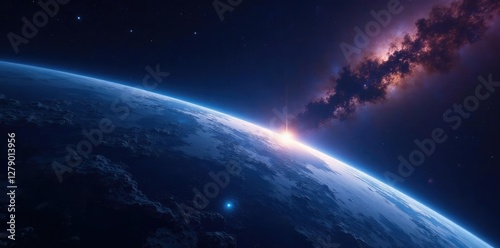 © PHOUVONG , Obraz premium Planet Earth's upper curve against starry night sky, planet, sky