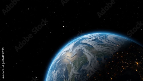 Obraz premium Planet, Earth, space — a breathtaking high-resolution image reveals Earth's curved horizon against deep space, showcasing glowing city lights, swirling clouds, oceans, continents, and the delicate blu