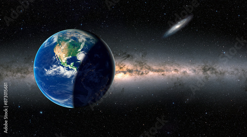 Obraz premium Planet Earth with a spectacular sunset , Milky Way and Andromeda galaxy in...