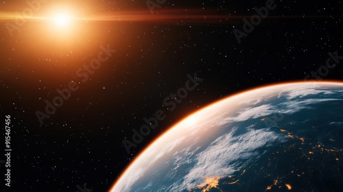 Fototapeta premium Planet Earth with sunrise from space, dark background, high resolution, empty space for text, glowing horizon, celestial rays, space poster