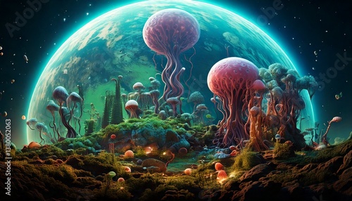 Fototapeta premium planet ecosystem with bizarre life forms evolved under completely