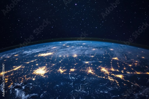 Fototapeta premium Planet spins in the cosmos, shedding light on cities with their evening radiance