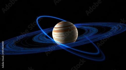 Fototapeta premium Planet with rings visible. Striking contrast between light, dark areas. Rings appear bright blue against black background. Space scene.