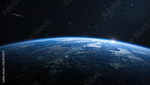 Obraz premium Planet with water and land suspended in outer space surrounded by stars