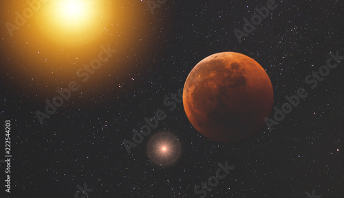 © kosssmosss, Fototapeta premium planeta w otwartej przestrzeni na tle nieskończonego szeregu gwiazd i galaktyk naszego wszechświata, rozświetlających blask słońca. Księżyc w kosmosie