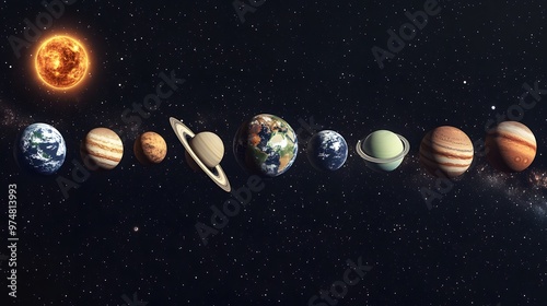 Fototapeta premium Planets Aligned in Dark Sky, Pattern Background, Wallpaper, Cover and Screen for Smartphone, PC, Laptop, 9:16 and 16:9 Format