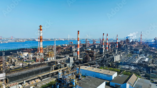 Obraz premium plant, aerial view, factory, petrochemical complex, steel mill, industry, drone, bird eye view, blue sky, environment, manufacturing, monodzukuri, japan, chimney, industrial area, technology, infrastr