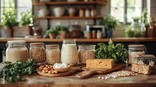 © bulegendut, Naklejka premium Plant-based milk, cheese, grains, and nuts on kitchen counter.