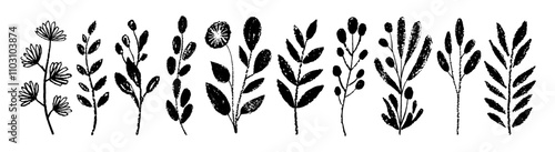 Fototapeta premium Plant, flower, leaf in brush silhouette vector set. Floral hand drawn crayon paint branch. Abstract doodle black silhouette sketch ink illustration. Simple stroke doodle plant, flower, leaf branch art