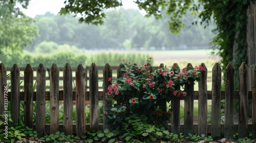 © Ilmi, Fototapeta premium Plant framed wooden garden fence. fence with trees