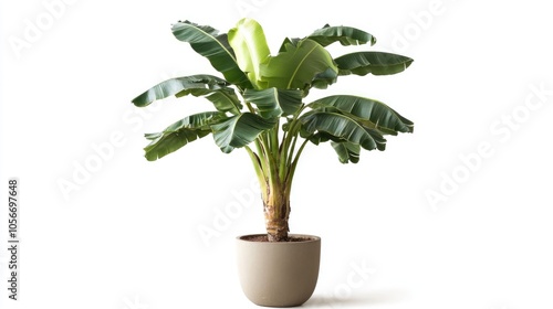 © NFTNexus, Obraz premium Plantain tree in a pot viewed from the front set against a white background
