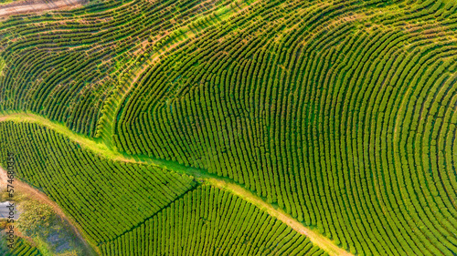 © Yellow Boat, Fototapeta premium Plantation ecological tea garden. Green tea mountain. tea plantation background. Beautiful Tea field leaf on mountain.