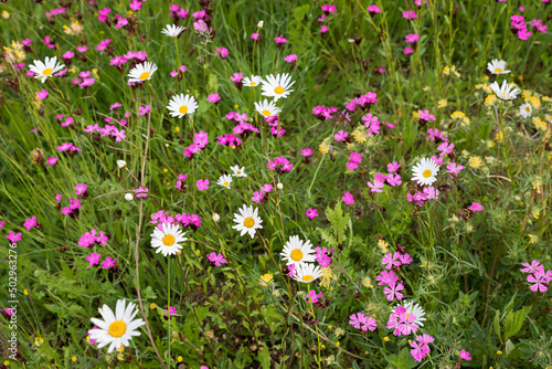 © SusaZoom, Naklejka premium plantation for insects, with pink lychnis, marguerites and hormon flowers