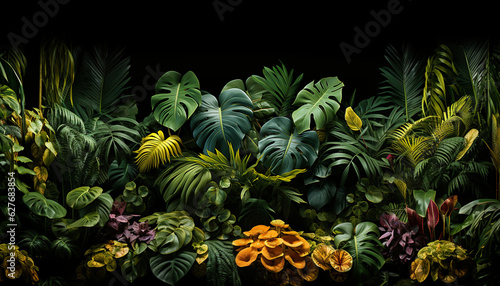 Fototapeta premium Plants and leaves of the Amazonian vegetation...Vertical garden with tropical green leaf contrast...Amazonian Vertical Garden: Contrast of Tropical Plants and Leaves. Generative AI,