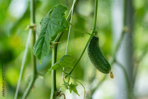 Naklejka premium Plants in greenhouse. Greenhouse Cucumber. Cucumber plants growing. Cucumber (Cucumis sativus)