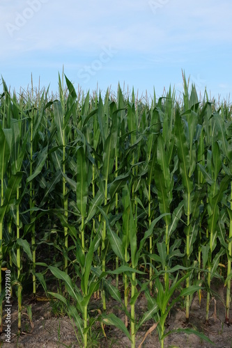 Fototapeta premium Plants of corn on a farm field under a blue sky. Agricultural landscape.