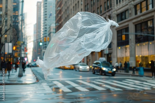 Obraz premium Plastic bag floating over crosswalk in busy city