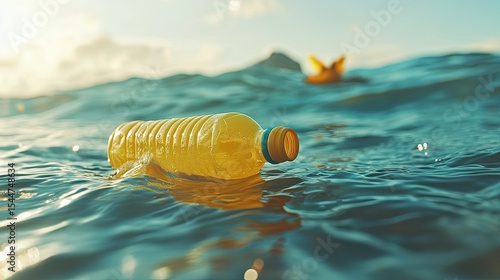 Obraz premium Plastic bottle floating on ocean surface, illustrating pollution in marine environment, vibrant waves and sunlight reflecting, highlighting environmental issues